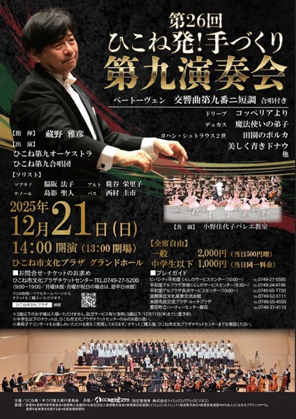 | 2025年12月21日(日) 開演 14:00 第26回彦根発!手づくり第九演奏会 ひこね市文化プラザグランドホール 指揮:藏野 雅彦 ひこね第九オーケストラ ひこね第九合唱団 ソリスト : 𦚰阪 法子(ソプラノ)、糀谷 栄里子(アルト)、島影 聖人(テノール)、西村 圭市(バス) 共演 : 小野佳代子バレエ教室 プログラム:デュカス /「ラ・ペリ」よりファンファーレ ドリーブ /コッペリアより「序奏とマズルカ」 ヨハン・シュトラウス2世 /田園のポルカ デュカス /魔法使いの弟子 ヨハン・シュトラウス2世 /美しく青きドナウ ベートーヴェン 交響曲第9番ニ短調「合唱付き」 ![]() |